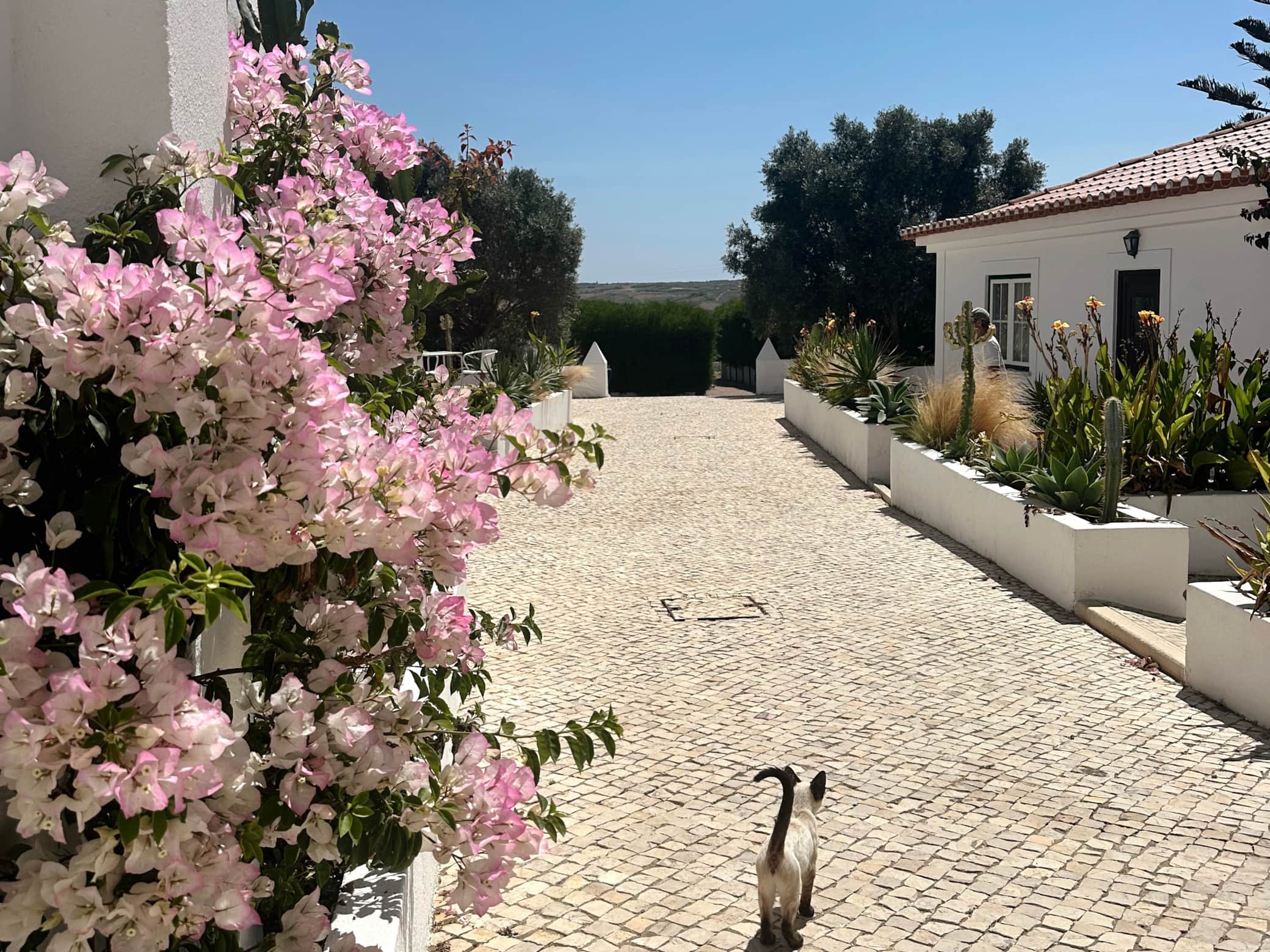 Head North on N247 towards Assenta. You will pass Ribamar and São Lourenço. Once you pass Barril, you are getting close. Once you see a sign for Assenta, turn left onto Rua Principal. Follow it down, and turn left once you hit the T to stay on Rua Principal. Then turn left on Rua das Praias. Follow it until you see the second Bairro da Quinta, and turn left again. Follow the road down until it curves to the left and you will see us, number 34 at the end of the street on the righ hand side. We have white walls and three large green gates. Park on the street and ring the bell next to the small gate. We will come and meet you and get you checked in.